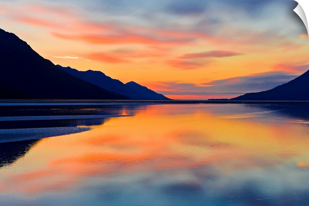 <p>Expansive photograph of the Turnagain Arm in the Cook Inlet in Alaska (AK) during sunset. Calm water is bordered on both sides by large mountains.</p>