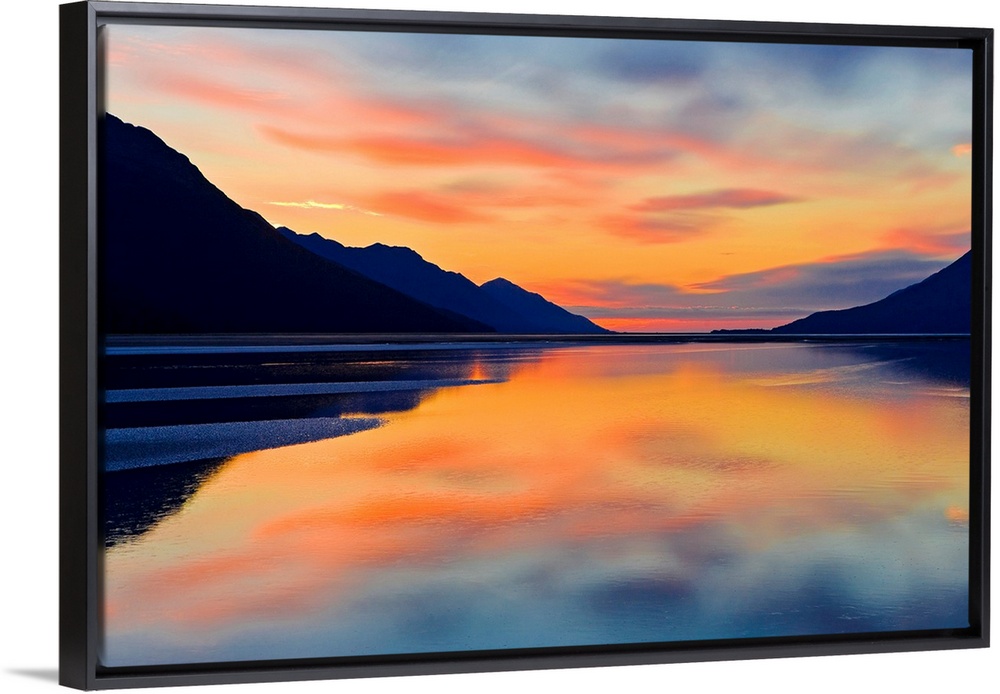 <p>Expansive photograph of the Turnagain Arm in the Cook Inlet in Alaska (AK) during sunset. Calm water is bordered on both sides by large mountains.</p>