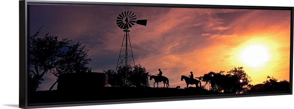 <p>This panoramic photograph depicts an evening moment on ranch hill side as horseback riders pass by a windmill trees.</p>