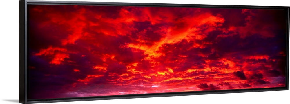 <p>Panoramic image of low level clouds in the sky reflecting the brilliant colors of the sunset to where it looks like the sky is on fire.</p>