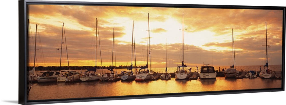 <p>Horizontal panorama of a row of sailboats with their sails down, docked at a port on a lake at sundown in New England.</p>