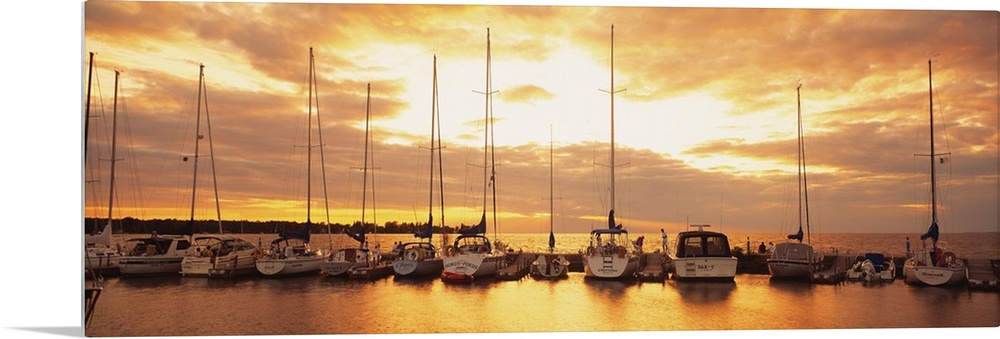 <p>Horizontal panorama of a row of sailboats with their sails down, docked at a port on a lake at sundown in New England.</p>