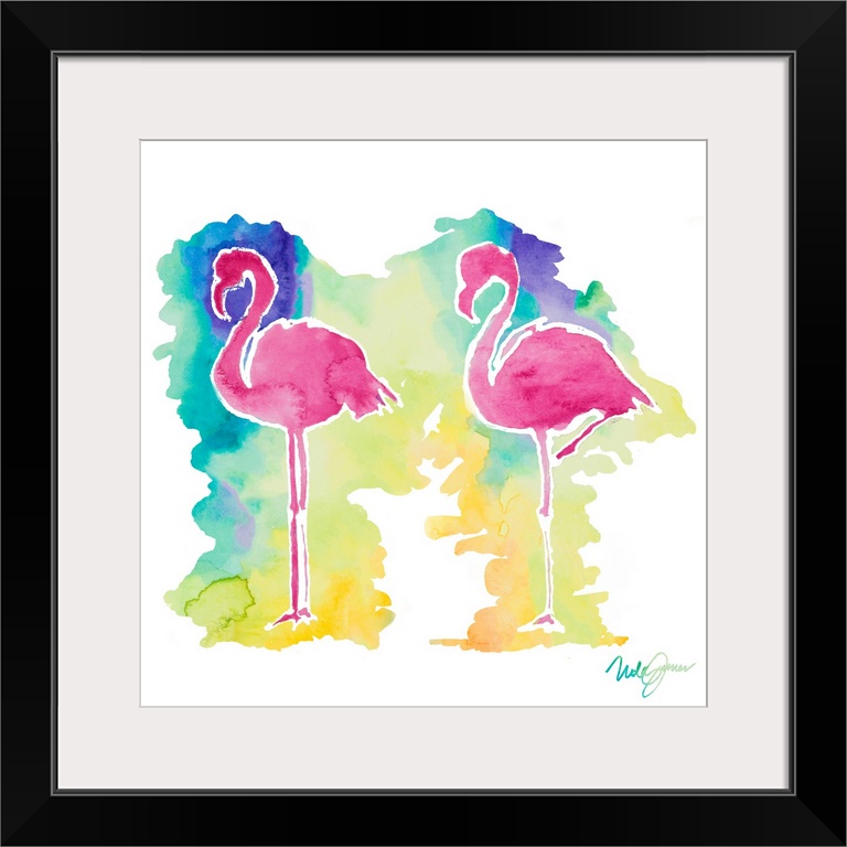 <p>Square watercolor painting two pink flamingo silhouettes with a colorful background.</p>