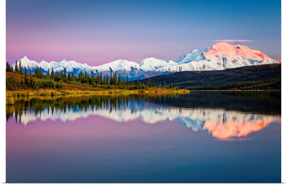 <p>Sunset glow on Mount Denali (McKinley) reflects on Wonder Lake with pastel sky, Denali National Park and Preserve in autumn, Interior Alaska, Alaska, United States of America</p>