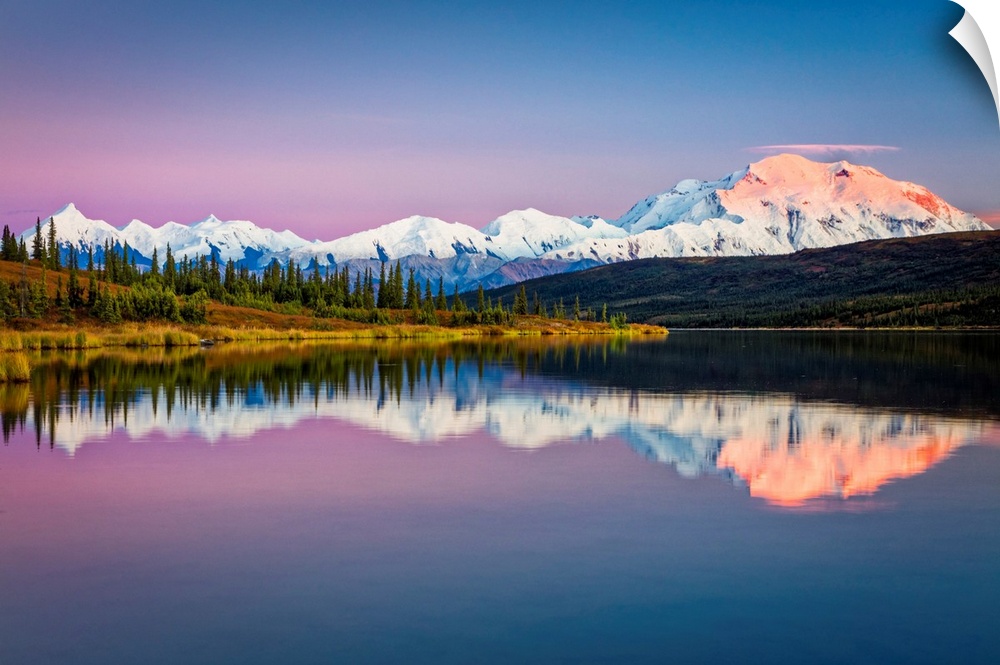 <p>Sunset glow on Mount Denali (McKinley) reflects on Wonder Lake with pastel sky, Denali National Park and Preserve in autumn, Interior Alaska, Alaska, United States of America</p>
