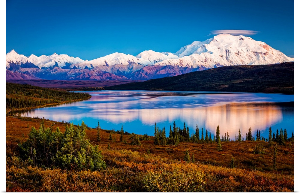 <p>Sunset glow on Mount Denali (McKinley) reflects on Wonder Lake with pastel sky, Denali National Park and Preserve in autumn, Interior Alaska, Alaska, United States of America</p>