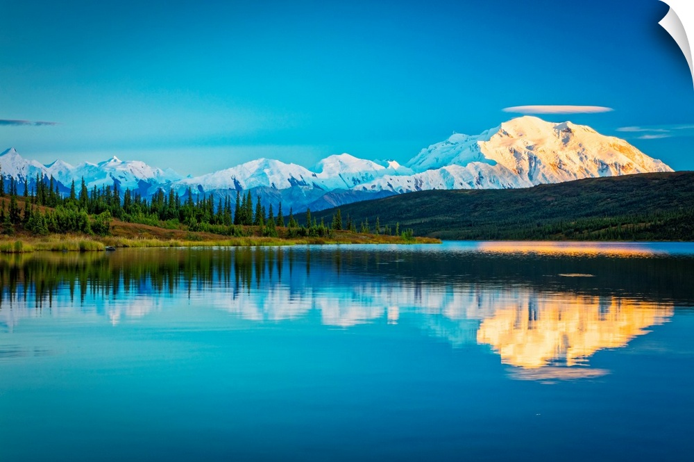 <p>Sunset glow on Mount Denali (McKinley) reflects on Wonder Lake in autumn in Denali National Park and Preserve, Interior Alaska, Alaska, United States of America</p>