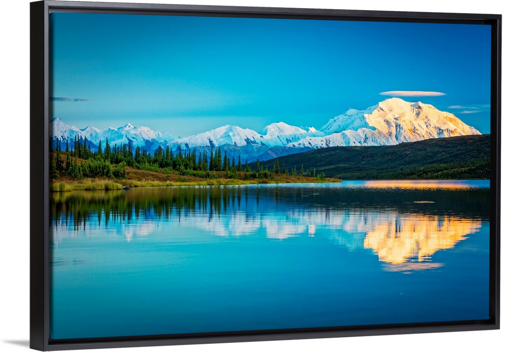 <p>Sunset glow on Mount Denali (McKinley) reflects on Wonder Lake in autumn in Denali National Park and Preserve, Interior Alaska, Alaska, United States of America</p>