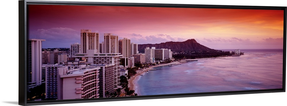 <p>Rosy colors from the setting sun wash over the tropical island city next to the waterfront on Waikiki Beach, with Diamond Head in the distance.</p>