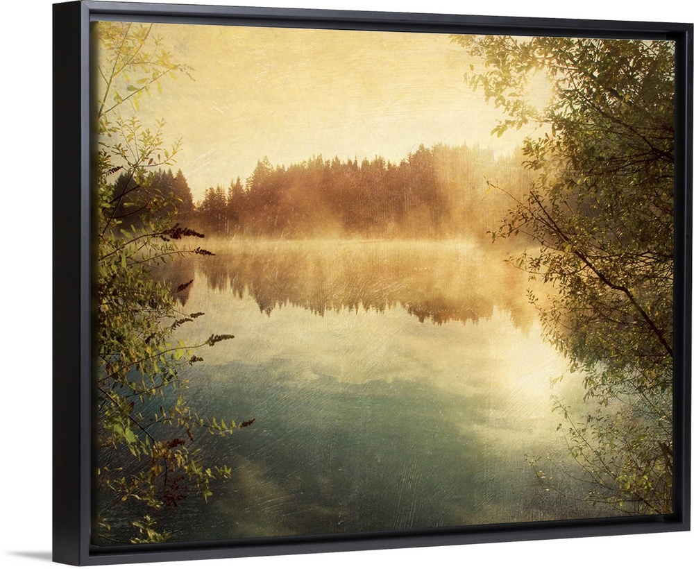 <p>Large photograph taken from between two trees overlooks a calm body of water reflecting the sky and tree line on the opposite shore. Artist overlays gentle brush strokes to give this piece added depth.</p>