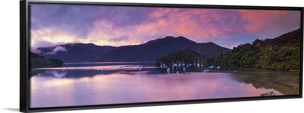 <p>Sunset illuminates the picturesque Ngakuta Bay, Queen Charlotte Sound, Marlborough Sounds, South Island, New Zealand</p>