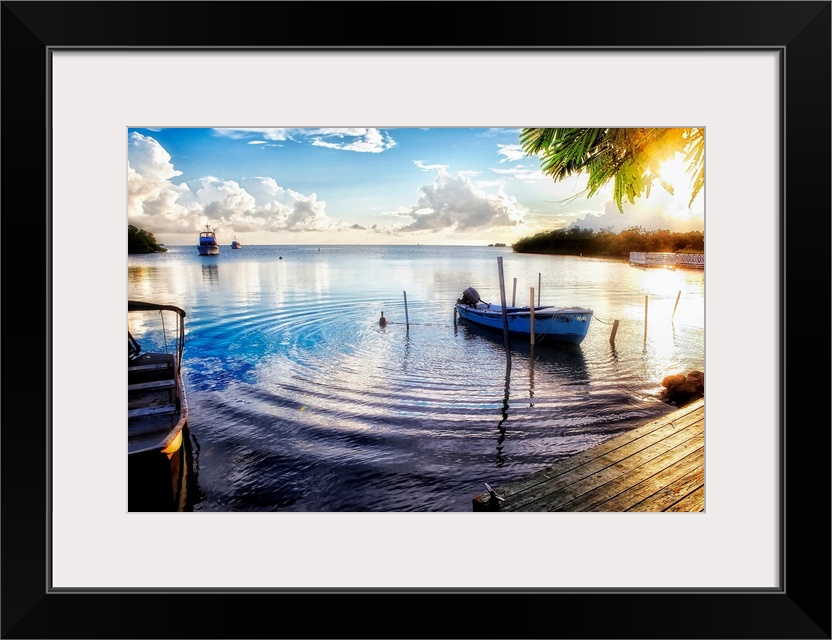 <p>Huge photograph includes a number of boats sitting within a bay of a tropical island as the sun begins to set. One of the boats in the foreground sends out ripples that reach out and touch the dock and shore in front of it.</p>