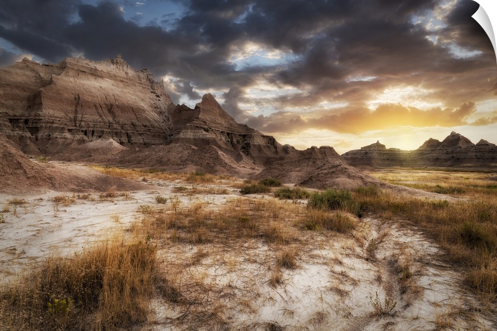 <p>Sunset in dramatic skies over the hoodoo peaks of the Badlands.</p>