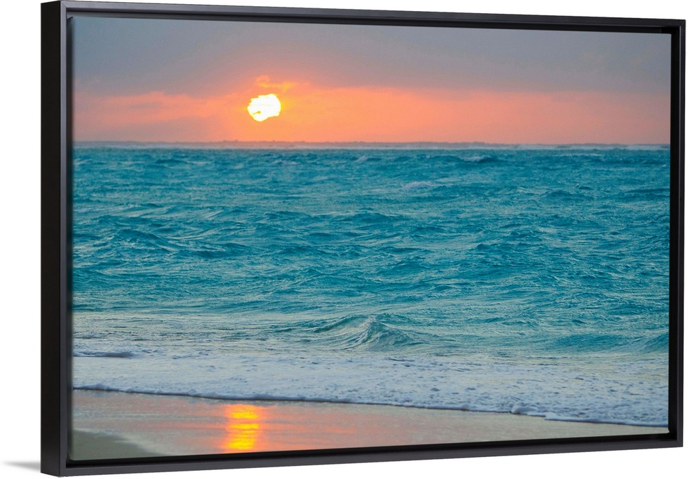 <p>From the National Geographic Collection, a photo canvas of choppy ocean waves crashing onto a tropical beach with a warm setting sun.</p>