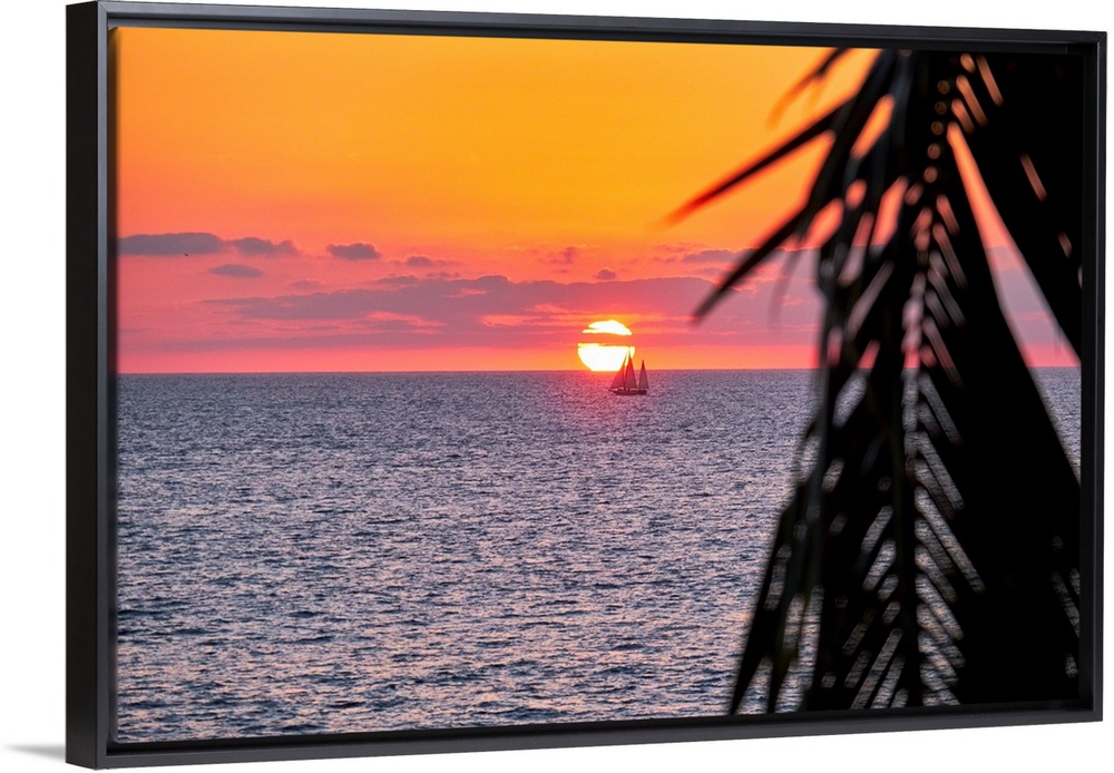 <p>A photo of sun setting behind a boat on water in Puerto Vallarta, Mexico with a palm tree leaf on the right.</p>