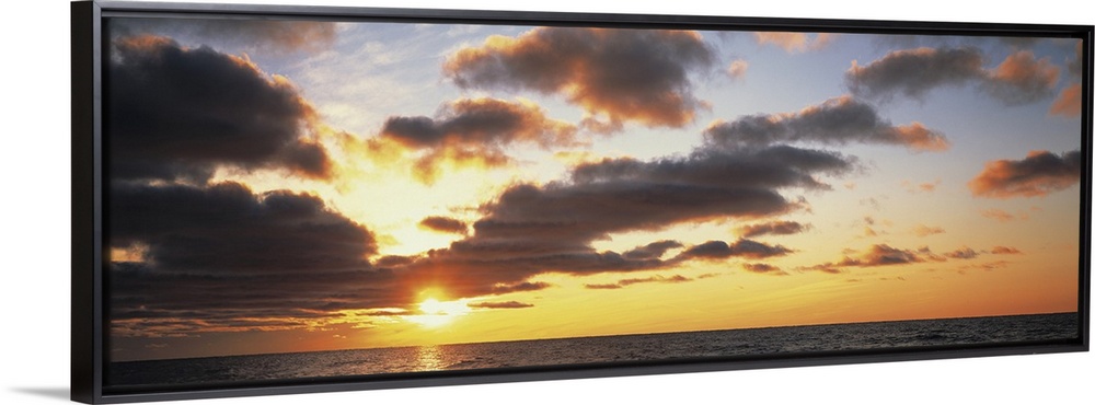 <p>Wide angle photograph of the sun setting slightly behind clouds, over the vast waters of Lake Michigan.</p>