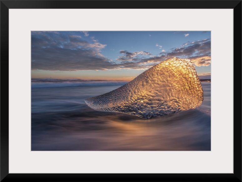 <p>Sunset Light Is Shining Through A Piece Of Ice Along The South Coast Of Iceland, Iceland</p>