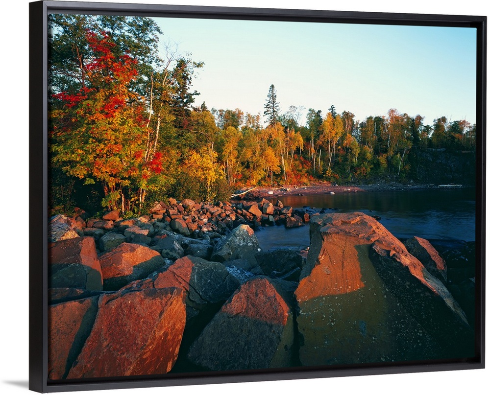 <p>The sun illuminates rust colored rocks and autumn trees at a rocky lake side beach in this landscape photograph.</p>