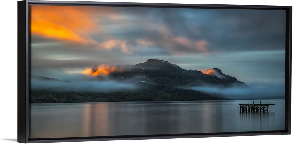<p>Sunset light over the fjord near the remote town of Djupavik along the Strandir Coast; Djupavik, West Fjords, Iceland</p>