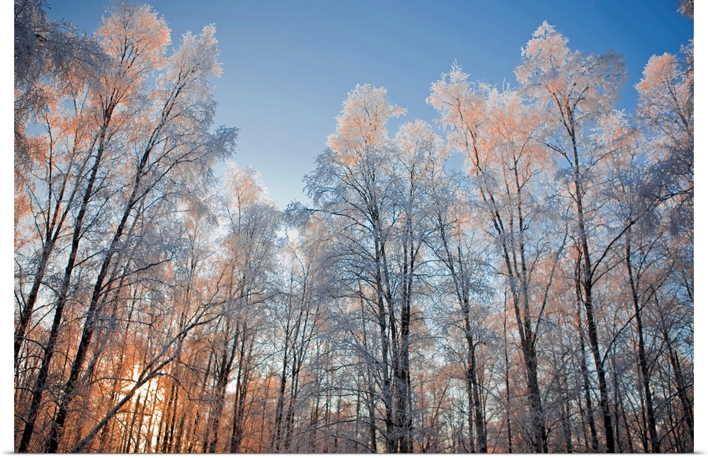 <p>Photograph taken from the ground and looking up at birch trees that are illuminated by the sunset behind them.</p>