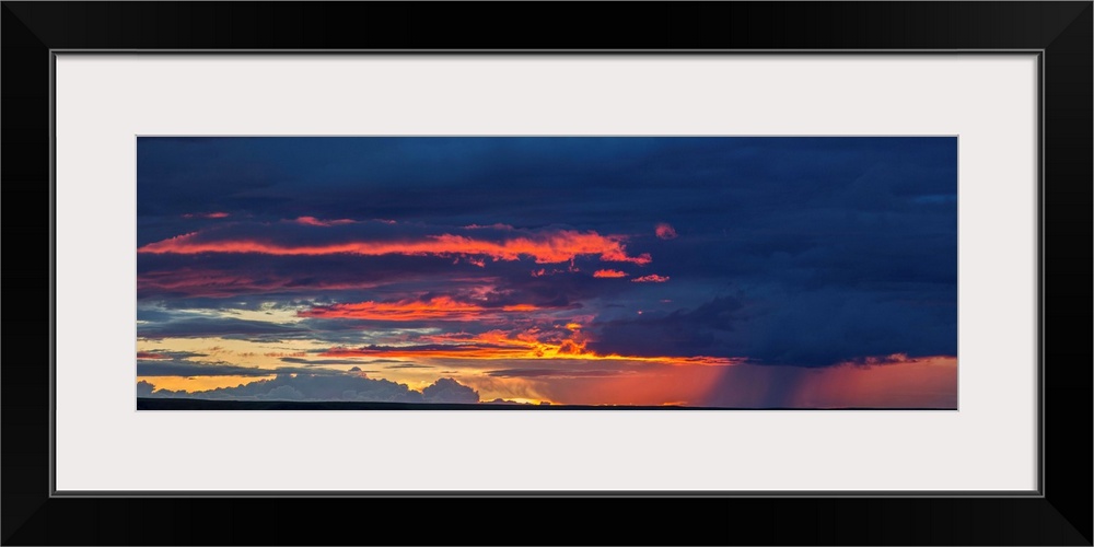 <p>Panoramic view of sunset lit clouds and a rain shower over Grasslands National Park, Saskatchewan, Canada.</p>
