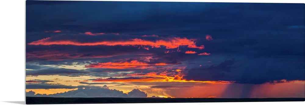 <p>Panoramic view of sunset lit clouds and a rain shower over Grasslands National Park, Saskatchewan, Canada.</p>