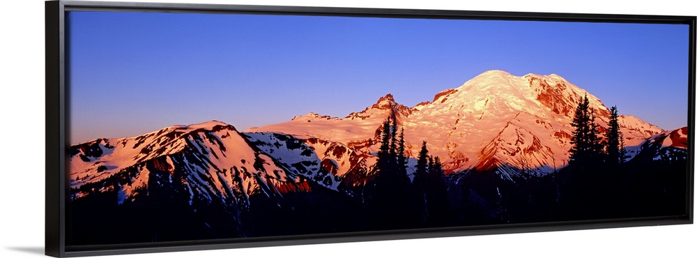 <p>Panoramic photograph taken of snow topped mountains during sunset with the trees in front silhouetted.</p>