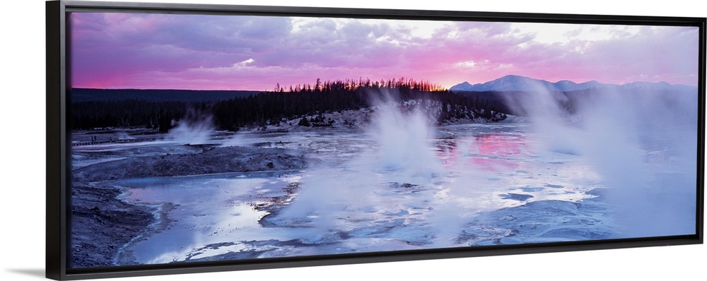 <p>Large panoramic piece of geysers in Wyoming as the sun sets in the distance and gives the sky pink and purple hues.</p>