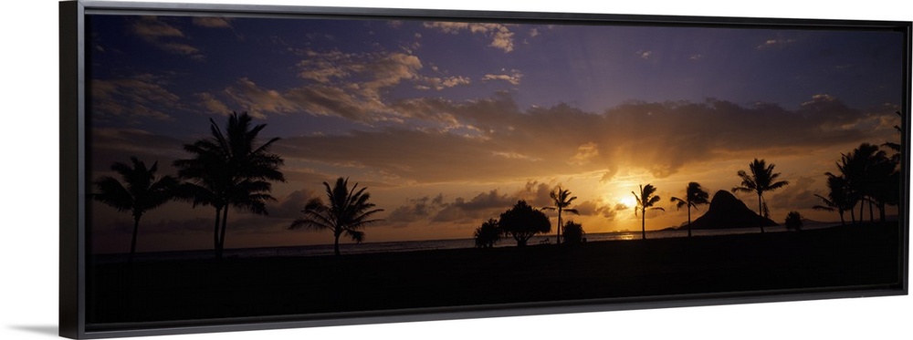 <p>Panoramic photograph taken of a sunset in Hawaii with the land and palm trees silhouetted.</p>