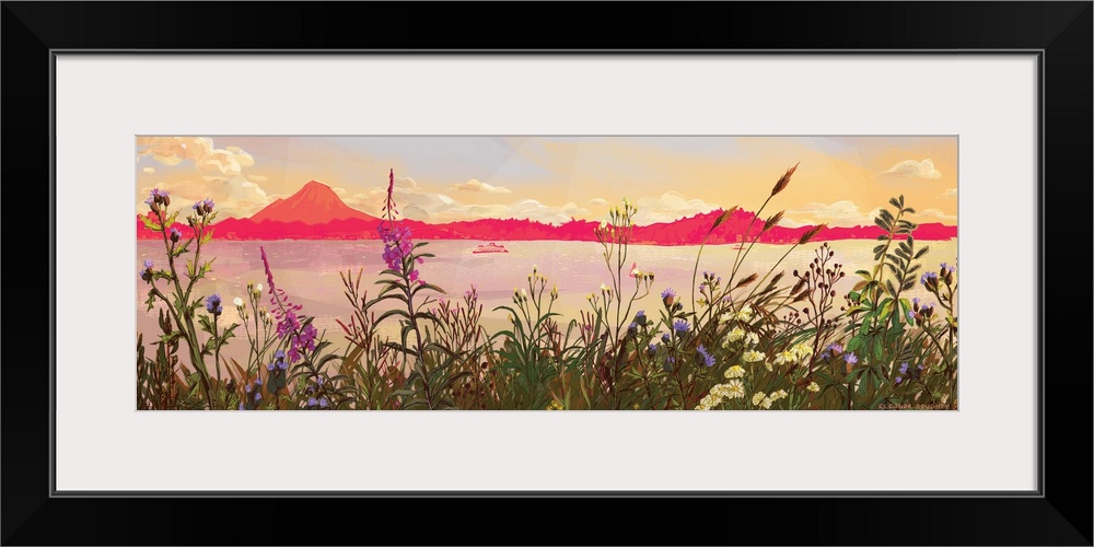<p>A distant ferry cruises through Elliot Bay during sunset, framed by multicolored wildflowers in the foreground and a mountain range on the horizon.</p>