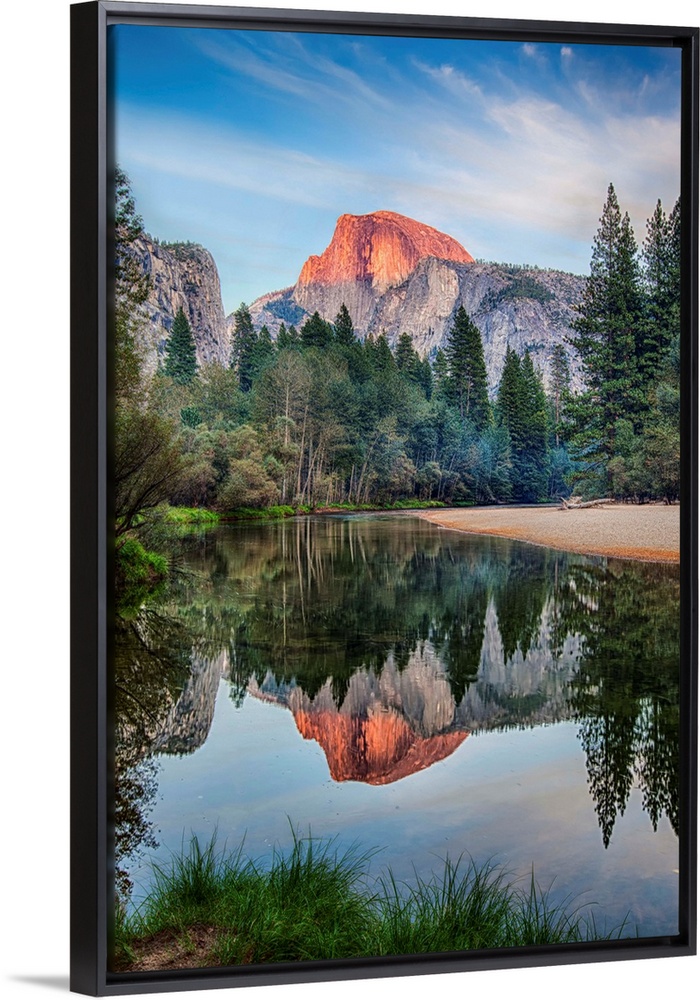 <p>Half Dome in Yosemite National Park is reflected in the water of the Merced River at sunset.</p>