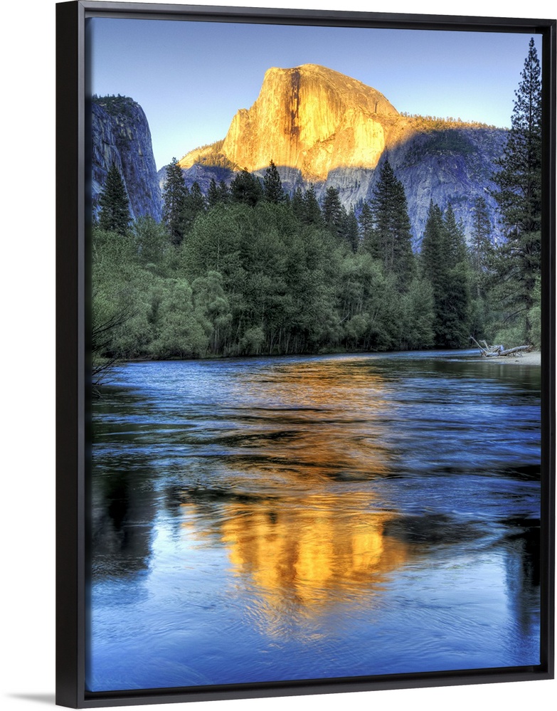 <p>Golden light of sunset on half Dome reflecting in Merced river in Yosemite National Park.</p>