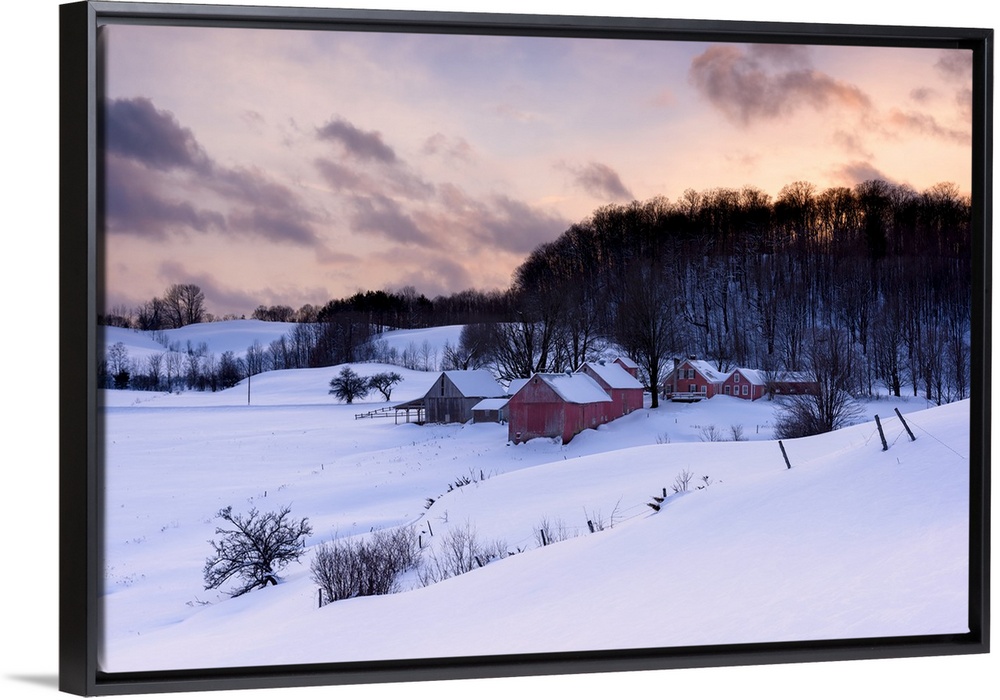 <p>Landscape photograph of a snowy Winter farm with red wooden buildings and a pretty sunset.</p>