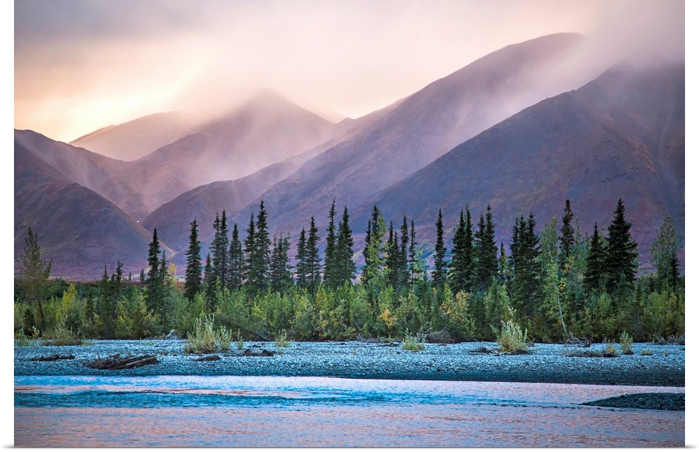 <p>Rain and snow squalls race over the mountains during sunset on the Kelly River, in the western Brooks Range of Noatak National Preserve, Alaska, USA.</p>