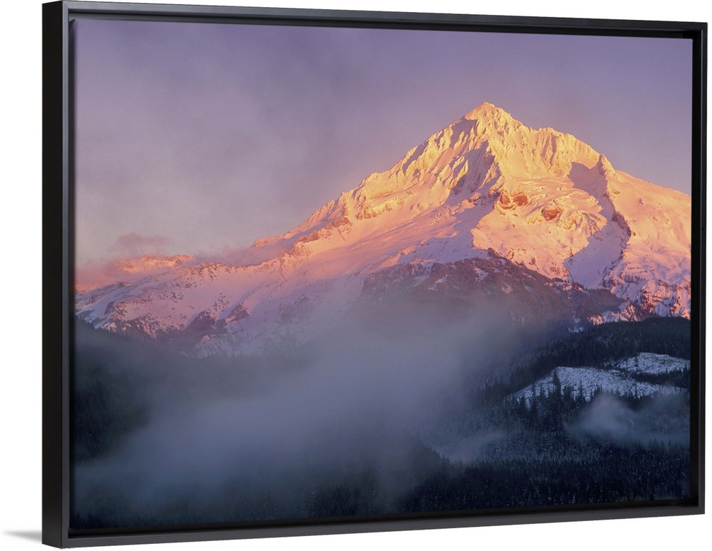 <p>Sunset colors the slopes of Mt Hood, Oregon, as clouds and fog sit in the valley.</p>