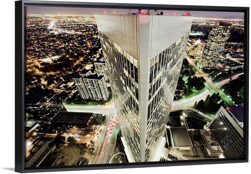 <p>Aerial photo of a triangular building in Los Angeles with the rest of LA lit up in the darkness behind it.</p>