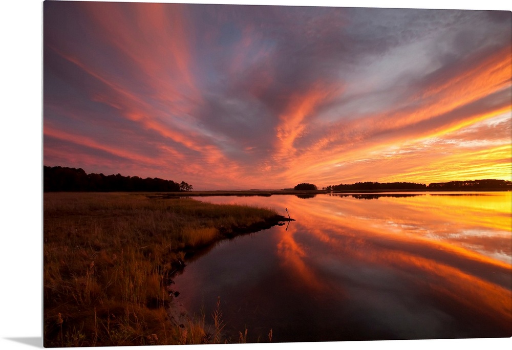 <p>From the National Geographic Collection, a big photograph displays a grassy shoreline for the largest isolated piece of land within the Chesapeake Bay. The colorful glow of the sun can be seen extending throughout the sky and over the calm waters below.</p>