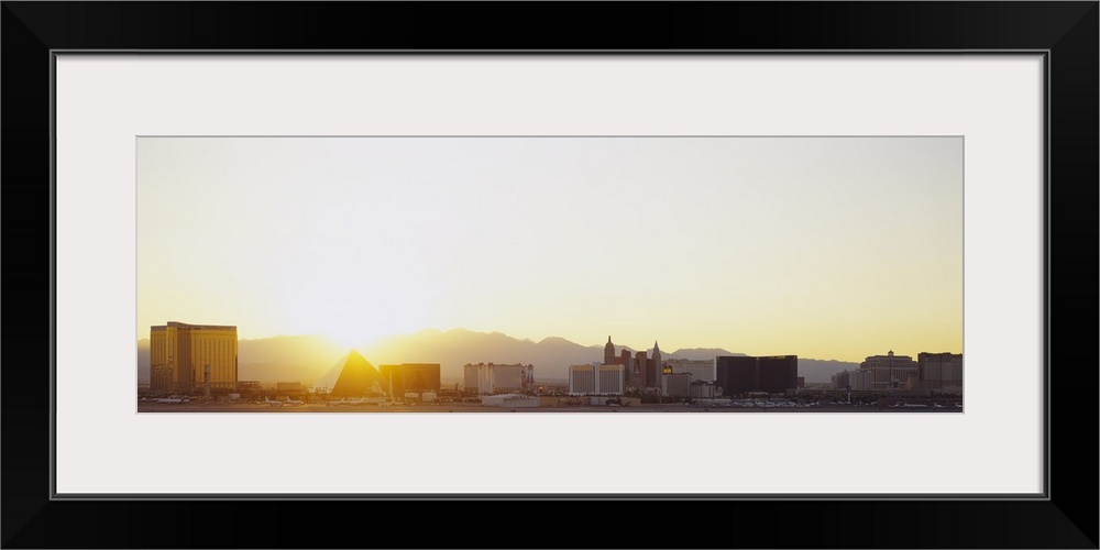 <p>Panoramic picture taken of the strip in Las Vegas with a bright sun setting behind the mountains in the distance.</p>