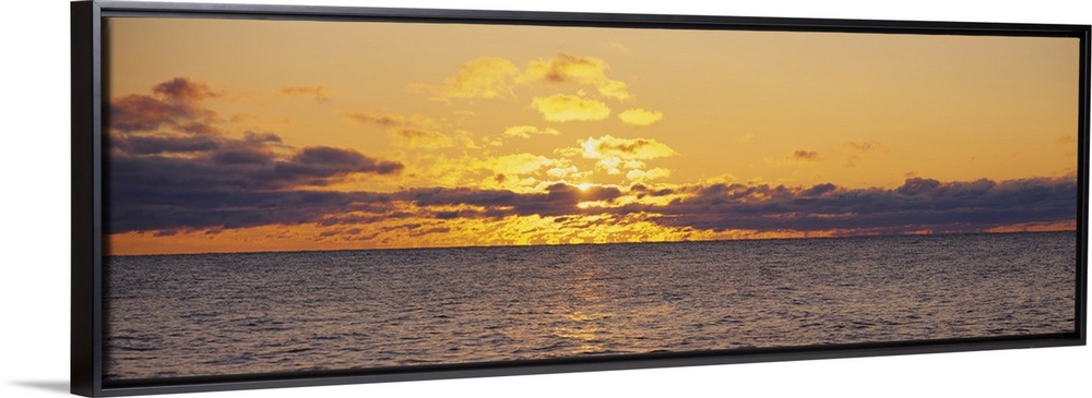 <p>Panoramic photo on canvas of a sunset shining through clouds above a lake.</p>