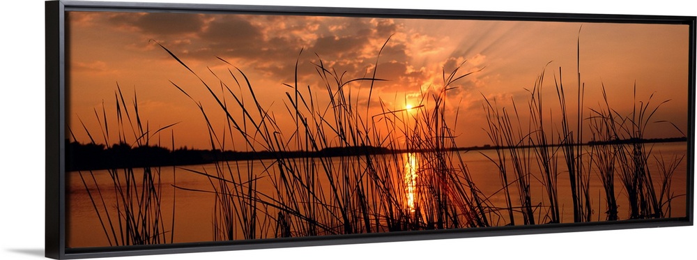 <p>Panoramic photograph of the sun setting over the horizon behind close up of reeds.</p>