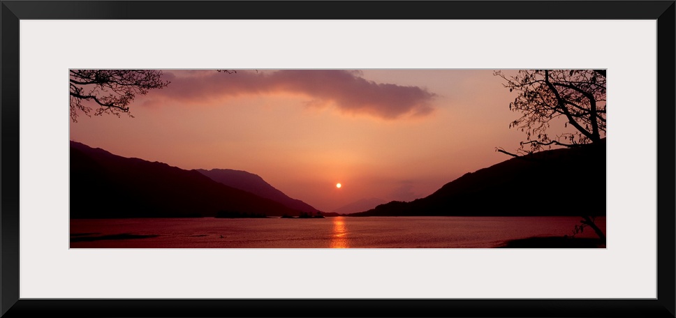 <p>Panoramic photo on canvas of a sunset over the water with rolling hills in the background.</p>