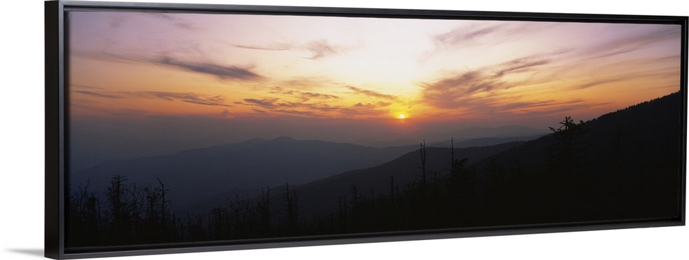 <p>Landscape photograph on a giant canvas of the sun setting behind wispy clouds, over Clingmans Dome in the Great Smoky Mountains National Park, in Tennessee.</p>