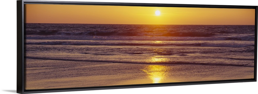 <p>Panoramic photograph of ocean at dusk with sun reflected in water.</p>