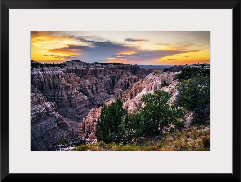 <p>Sunset paints the sky over a valley extending off Badlands National Park's Sheep Mountain.</p>