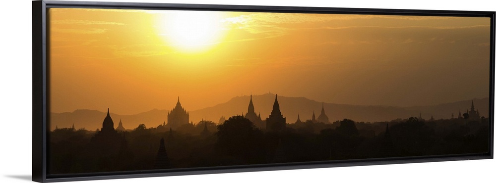 <p>Panorama landscape showing silhouettes of pagodas, temples and trees in Bagan, Myanmar (Burma) during sunset. Bagan is a site of a few square kilometers where more than 4400 pagodas and temples have been built to worship Buddha.</p>