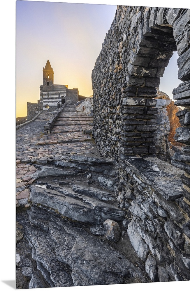 <p>Sunset over Chiesa di San Pietro, Portovenere, La Spezia, Liguria, Italy, Southern Europe</p>
