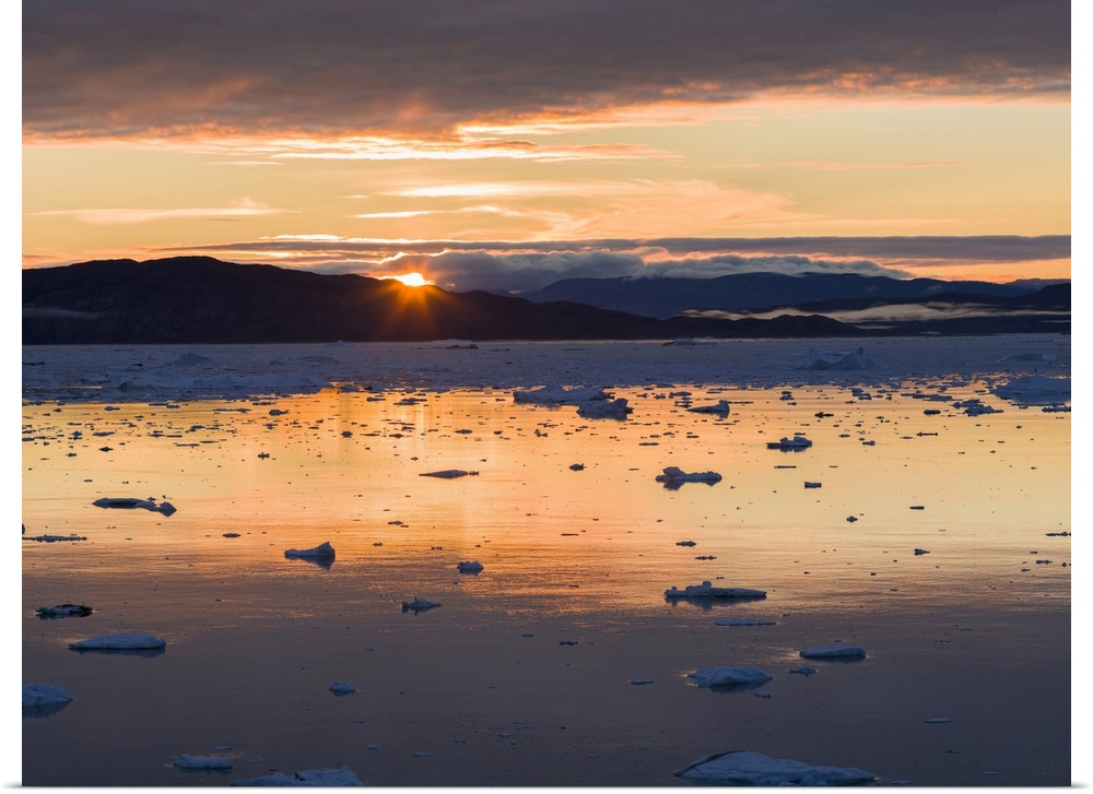 <p>Sunset over fjord with icebergs close to Eqip Glacier in Greenland, Danish Territory.</p>