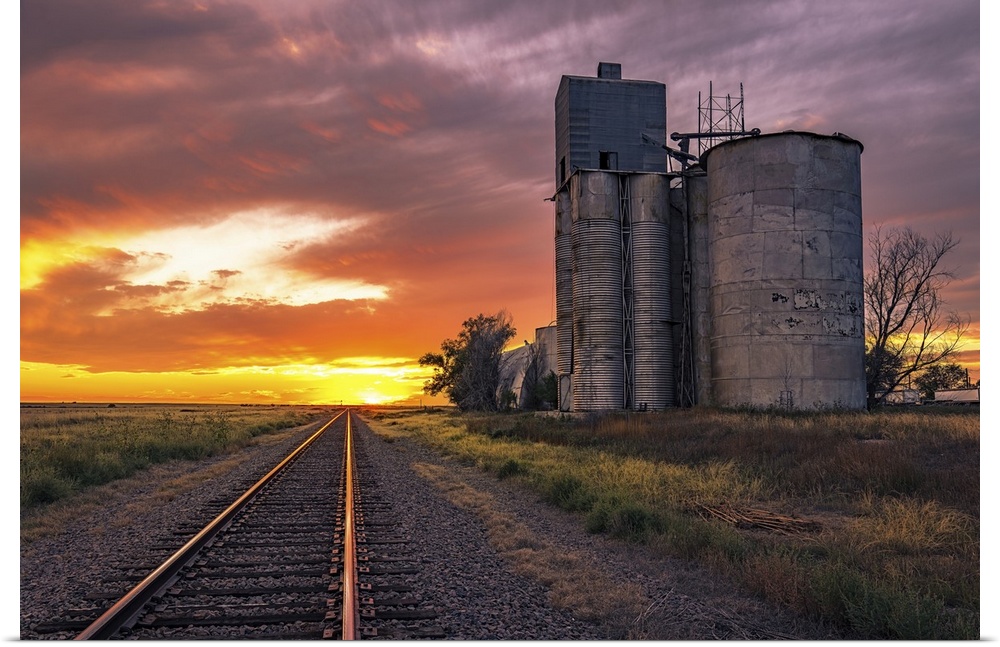 <p>Sunset shoots beautiful colors across the clouds above an old grain elevator in Kit Carson, a small town on the Colorado plains. Abandoned grain elevators dot the Great Plains, testament to the consolidation of the agricultural industry.</p>