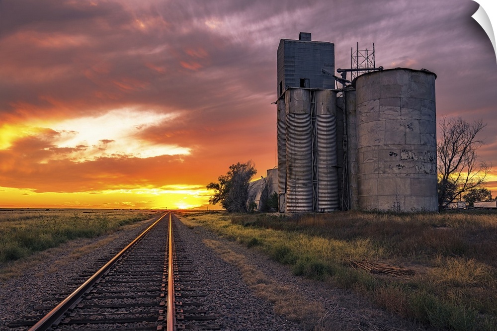 <p>Sunset shoots beautiful colors across the clouds above an old grain elevator in Kit Carson, a small town on the Colorado plains. Abandoned grain elevators dot the Great Plains, testament to the consolidation of the agricultural industry.</p>