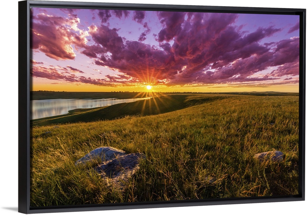 <p>Sunset over South Dakota's Lake Oahe is spectacular, with clouds turned crimson and beautiful light cast over the rolling prairies.</p>